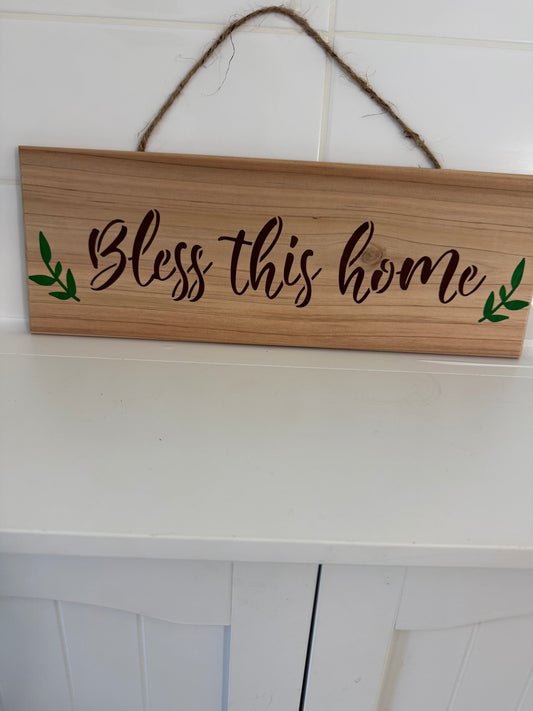 • Today’s Hobbies wooden sign with Bless this home text and green leaves rustic coffee kitchen wall decor