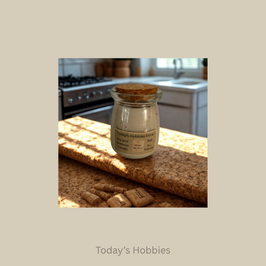 • Todays Hobbies handmade scented wax tarts in a glass jar with cork lid on kitchen counter