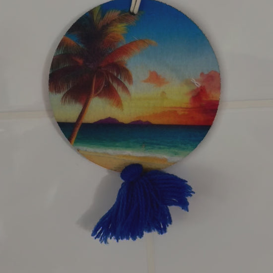 This unique home air freshener decor adds charm to bedrooms, bathrooms, or your work desk. The detailed artwork makes it stand out. It shows off bold colors and crisp lines. The tassel detail brings a playful touch to your décor. It fits into any modern or boho theme.